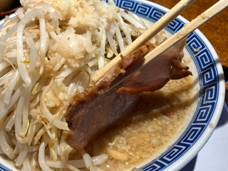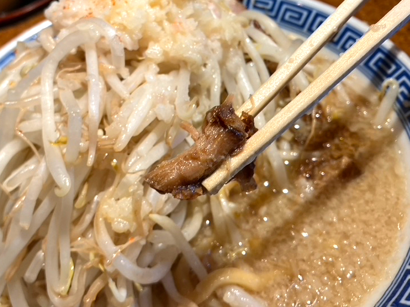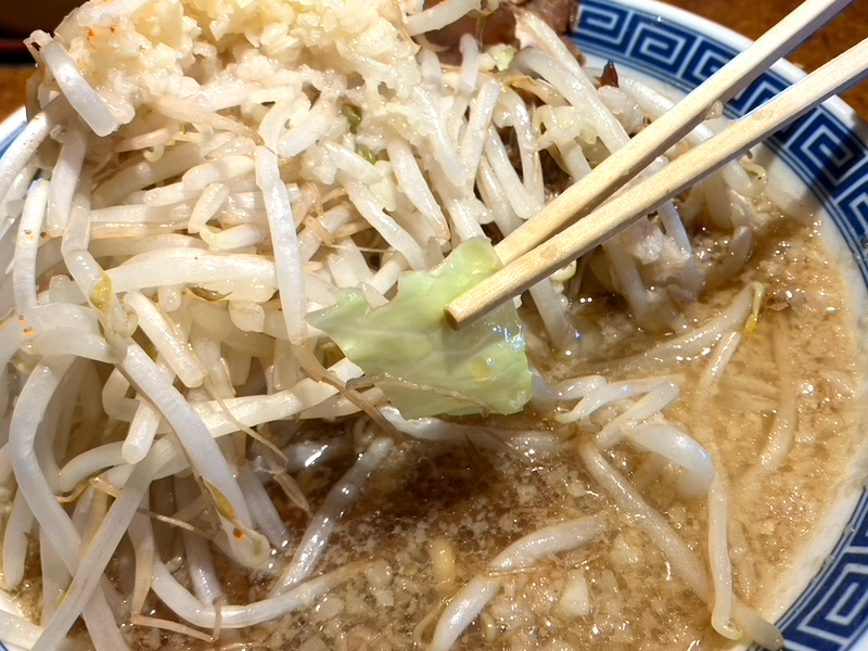 G麺には、野菜のもやし、キャベツとチャーシュー1枚ものと、切り落としのチャーシュー、にんにくと背脂がのってるれー。