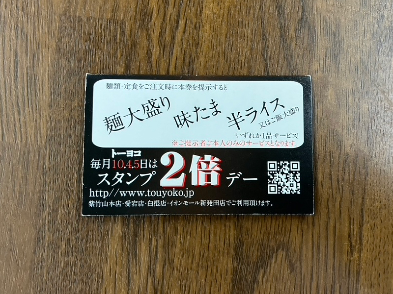 一回行ったら貰えるポイントカードには、麺大盛りか味たま、半ライスがサービスられー。