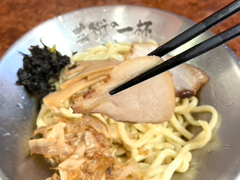 つけ麵の麺側にはチャーシュー、メンマ、岩のり、かつお節が乗ってるれー。