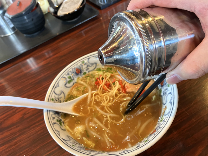 テーブルの調味料、トッピングはコショウ、すりおろしニンニクとゴマ、紅しょうがと粒のままのニンニクがあったれー。
